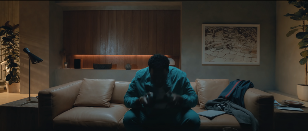 The ad opens with a scene of the man entering his home or apartment and sitting at his couch before being teleported away. The colours used to depict the mans living space are very dull with lots of beige, white and brown. The man sighs before sitting down which implies that he has just got done with a long day and is now ready to relax.