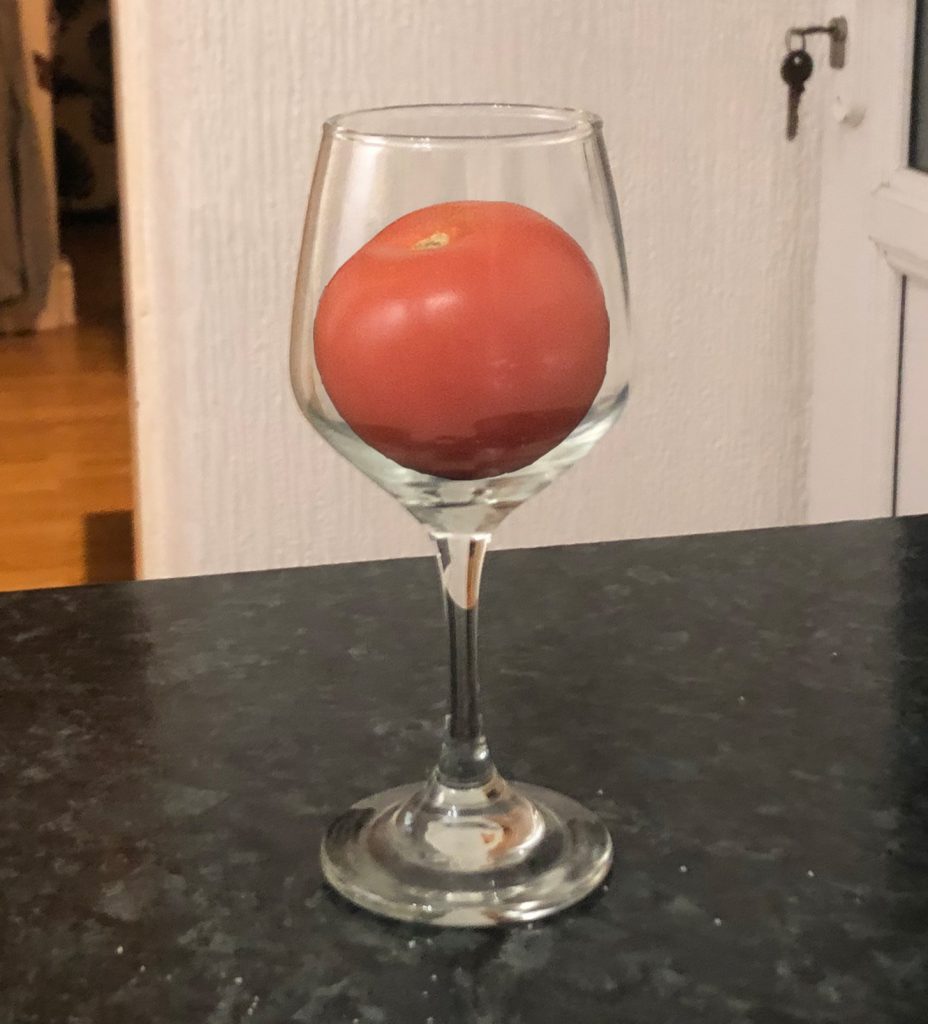 This is my attempt at making a tomato look like its within a wine glass using Photoshop. I used a tomato instead of an apple as I didn’t have any apples at home at the time. I have very little experience with photoshop so this attempt isn’t great but even then I am pleased that I at least managed to give off the effect that the tomato is within the glass even just a little bit.