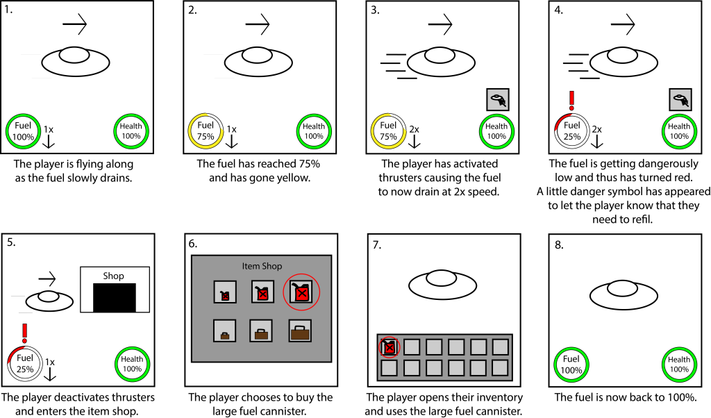 In order to showcase a narrative over a specific time within a specific space I have created a story board for how fuel will work in the game and how it is represented to the player through the UI. The story board shows the general loop of the fuel mechanic, starting with the fuel being full and draining at different speeds depending on the players actions, and ending with the player’s fuel getting low and being refilled back to 100% after using a fuel cannister bought from the item shop. This is the basic loop that will repeat over and over again throughout the game. I decided to represent the fuel and health as circles in the UI as I felt it looked clean and had a little more personality than if they were just vertical bars. The circles also utilize Edward Tufte’s theory of colour as discussed in the first post. When full the circle will be green however as it drains it will slowly turn yellow, then to orange and then finally red at around the 25% mark. I will be using a colour gradient to ensure a smooth transition of colours rather than it just instantly changing colours once it reaches a certain point.