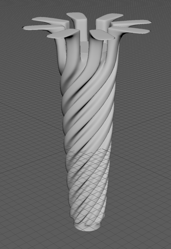 After this I got to work on creating the basic shapes for the heads. I extruded the top faces of the eight necks upwards and then extruded them all again outwards. This caused the necks to spiral above the handle and have these eight platform looking things which is where the heads would be located and built upon.